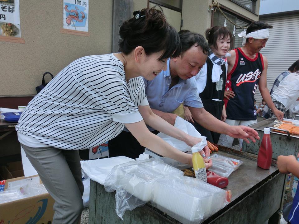 ヨーヨー釣り、金魚すくい、焼き鳥、焼きそば、フランク。