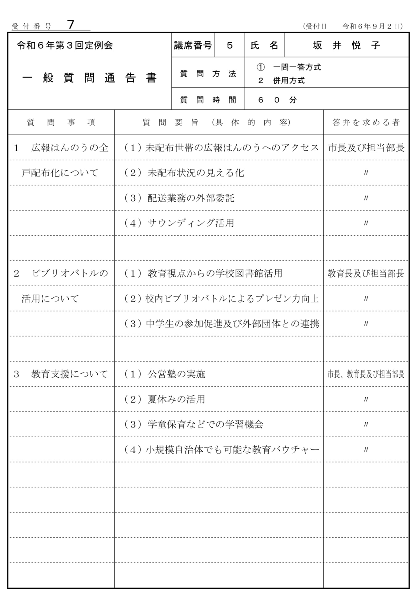 長期的に紙媒体がどうかとか、デジタル広報がという検討も当然必要ですが、まずは本来は全ての市民に一人ももれなく、現状は1人でも多く、必要な情報を届けるんだという検討を、担当課だけでなく、連携して進めていただきたいと思います。