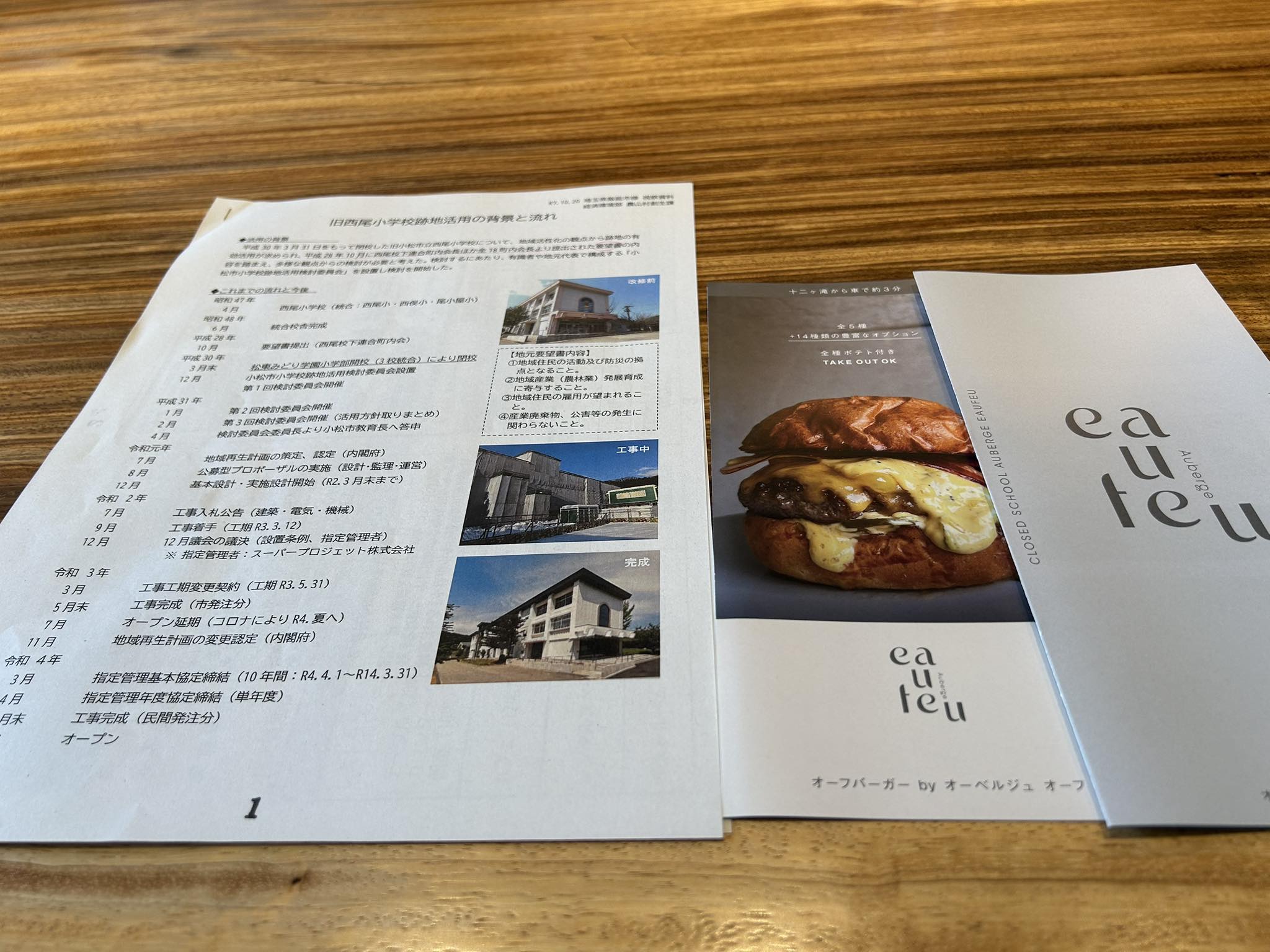 小松市では、小学校跡地の有効活用事業として、地域の防災拠点等従来の機能を維持しつつ、 「学び ・食・農体験ができる里山の活動拠点施設」とする基本構想に沿った事業展開のために公募型プロポーザル方式で公募を実施、オーベルジュ オーフ 観音下 西尾 (Auberge eaufeu) としてリノベーションされています。