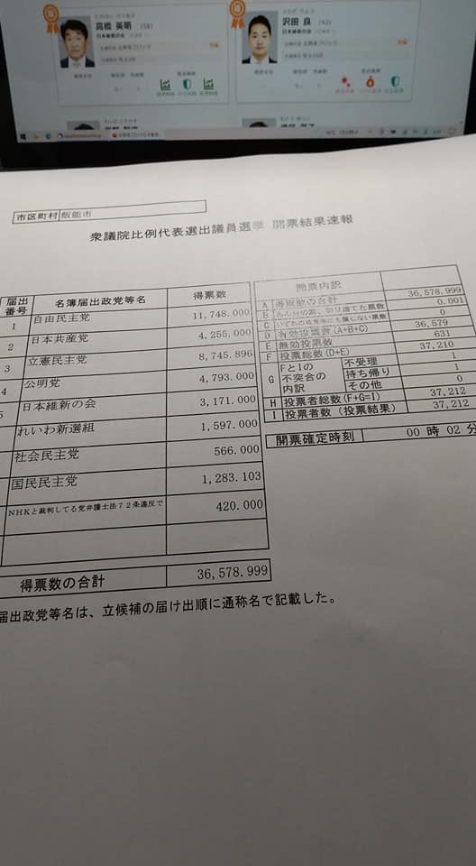 投票箱が閉まった20時には家を出て、今回は比例の立会人になっていました