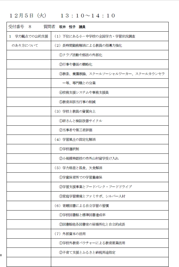 12月議会一般質問【学力観点での公的支援のあり方について】