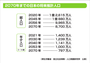総人口は、2020年の1億2615万人から減少を続け1 億人を割って2070 年には 8,700 万人という推計。