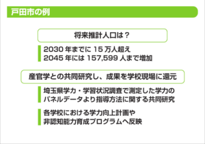 戸田市では、教育施策においても、授業改善及び教員の指導力向上を図り、教育政策室において実施する各種調査及び保有するデータを用いた産官学との共同研究に取り組み、成果を学校現場に還元しているそうです。