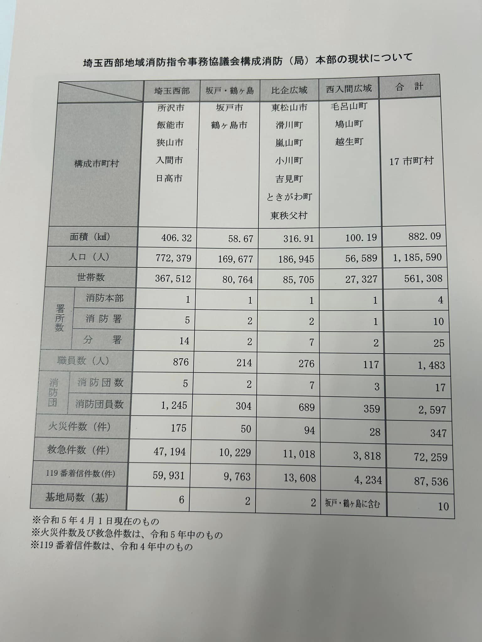 埼玉西部消防局、坂戸・鶴ヶ島消防組合消防本部、比企広域消防本部、西入間広域消防組合消防本部の4つの消防局本部が管轄する8市8町1村の119番通報を受信し、消防車や救急車等の出場指令を共同で行う指令センターで、管轄人口約119万人、年間約88,000件の119番通報を受信しています。