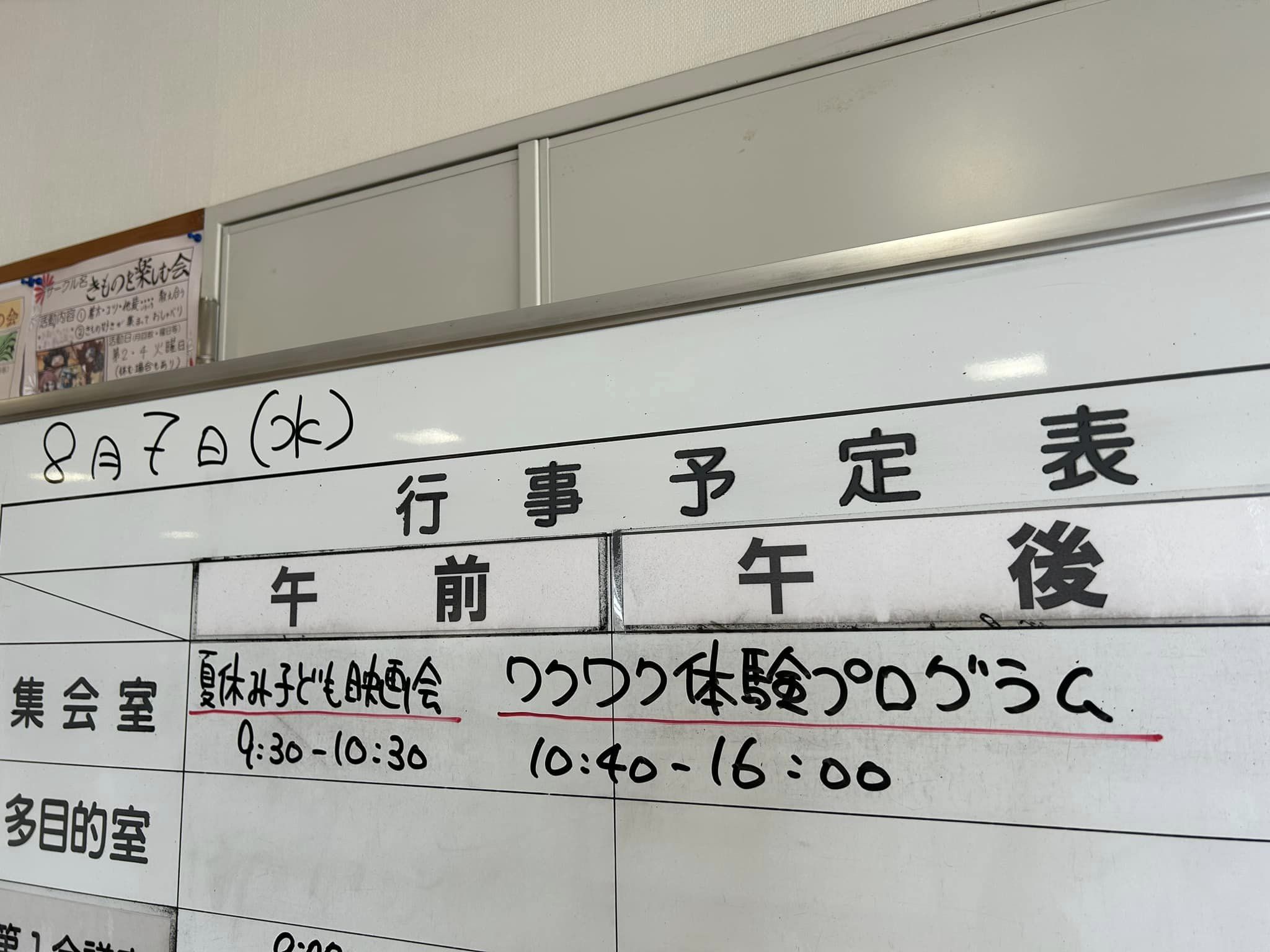 2024年8月7日 2024年8月8日 sakai 活動報告 夏休みの地区行政センターは 地区行政センターでは早くも、秋の文化祭に向けての〆切諸々。今日は決めること決まって一安心です。 双柳地区行政センターでは、夏休みの子どもたちへのプログラムがいっぱいでした。
