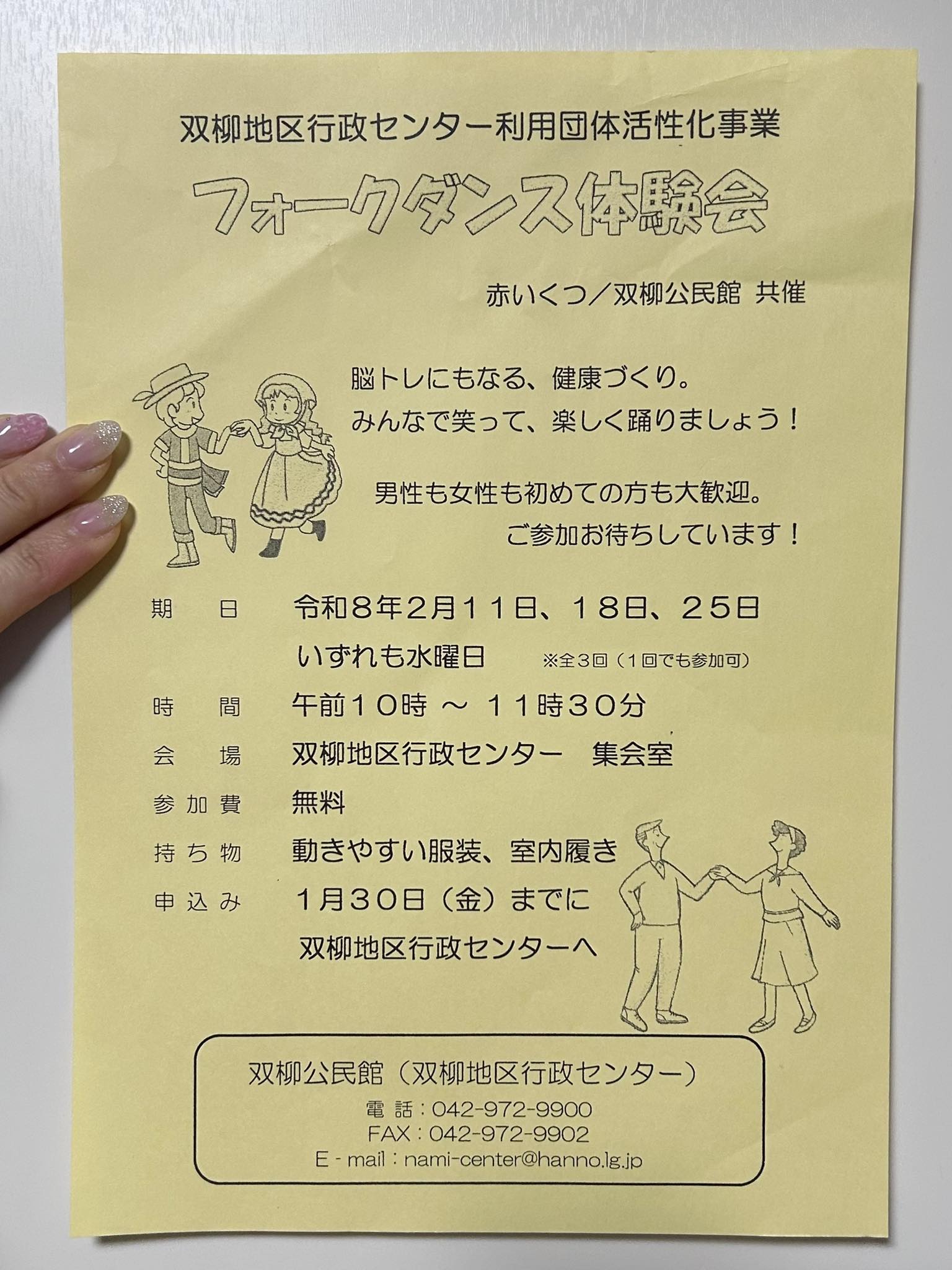 2026年2月11日 2026年2月11日 sakai 活動報告 双柳公民館共催「フォークダンス体験会」 双柳公民館と利用団体赤いくつ共催のフォークダンス体験会。多くの方にご参加いただけました。 寒くて小雨もちらつくお天気の中、ありがとうございました。所長さんにもご協力いただき感謝です。 今月の毎週水曜日、あと2回あります。 1回でも見るだけでもどなたでも大歓迎ですので、よろしければぜひのぞいてみて下さい。私もいます。お待ちしております。